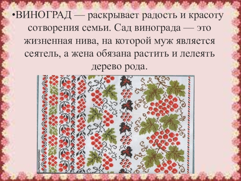 Слайд 9ВИНОГРАД — раскрывает радость и красоту сотворения семьи. Сад винограда — это жизненная