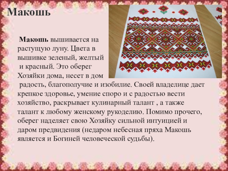 радость, благополучие и изобилие. Своей владелице дает крепкое здоровье, умение споро и с радостью вести хозяйство, раскрывает кулинарный талант , а также талант к любому женскому рукоделию. Помимо прочего, оберег наделяет свою Хозяйку сильной интуицией и даром предвидения (недаром небесная пряха Макошь является и Богиней человеческой судьбы).