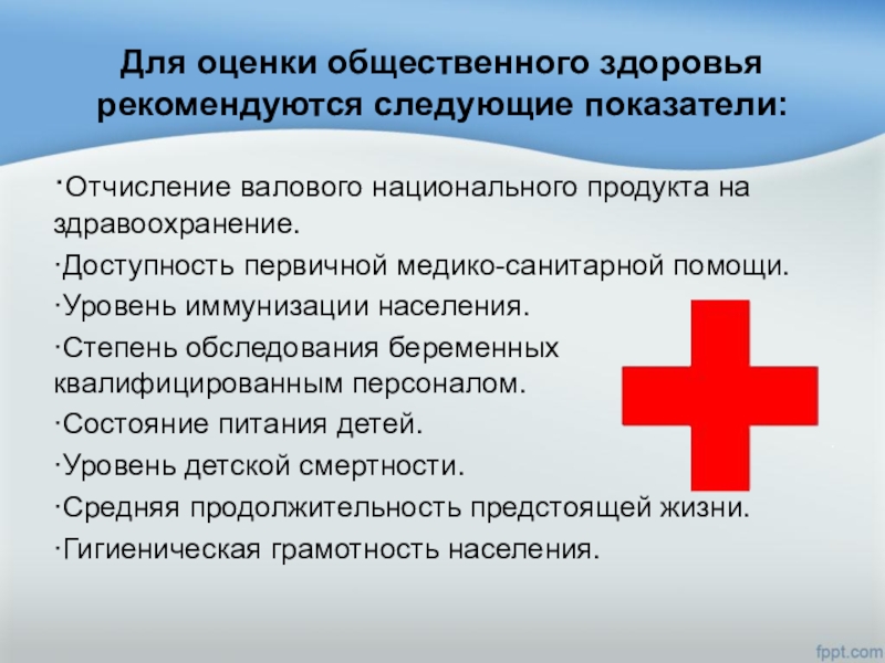 Слайд 11Для оценки общественного здоровья рекомендуются следующие показатели: