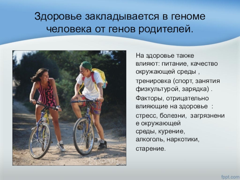 Слайд 13Здоровье закладывается в геноме человека от генов родителей.