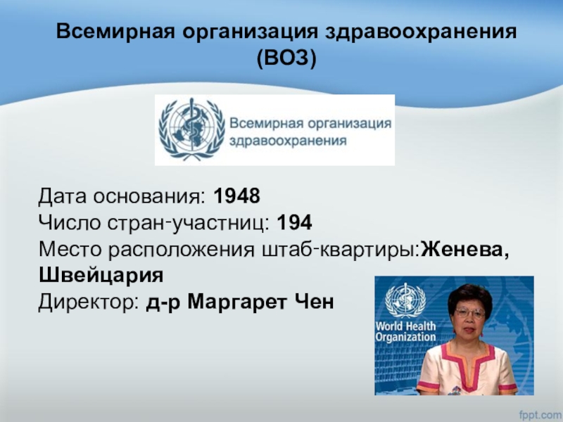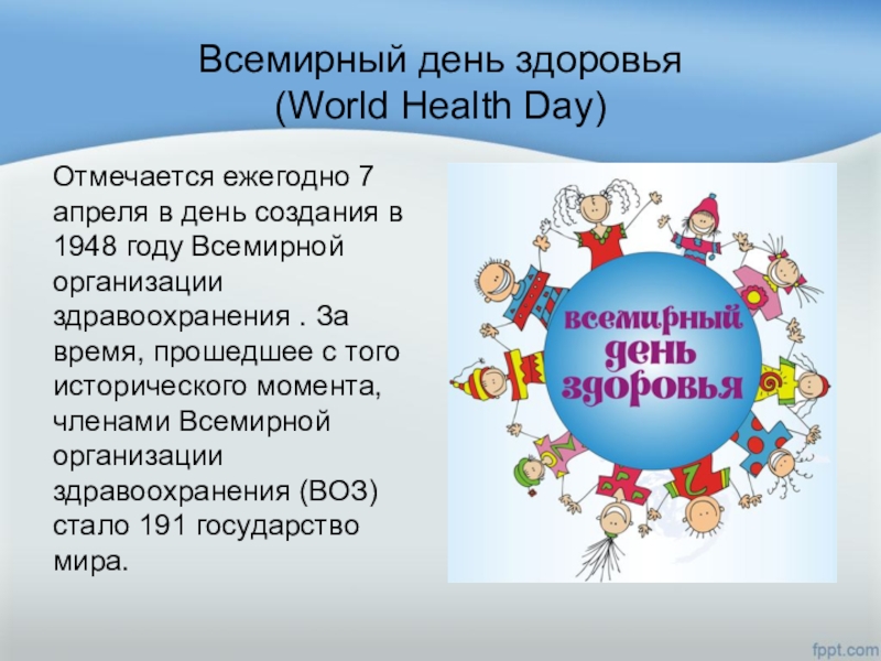 создания в 1948 году Всемирной организации здравоохранения . За время, прошедшее с того исторического момента, членами Всемирной организации здравоохранения (ВОЗ) стало 191 государство мира.