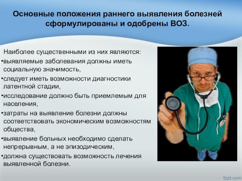 Слайд 10Основные положения раннего выявления болезней сформулированы и одобрены ВОЗ.
