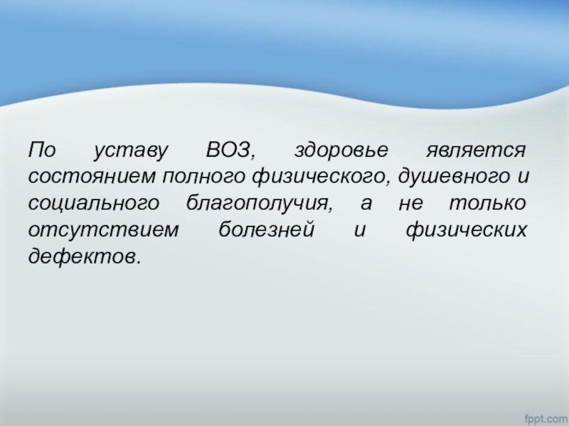 Слайд 7По уставу ВОЗ, здоровье является состоянием полного физического, душевного и социального