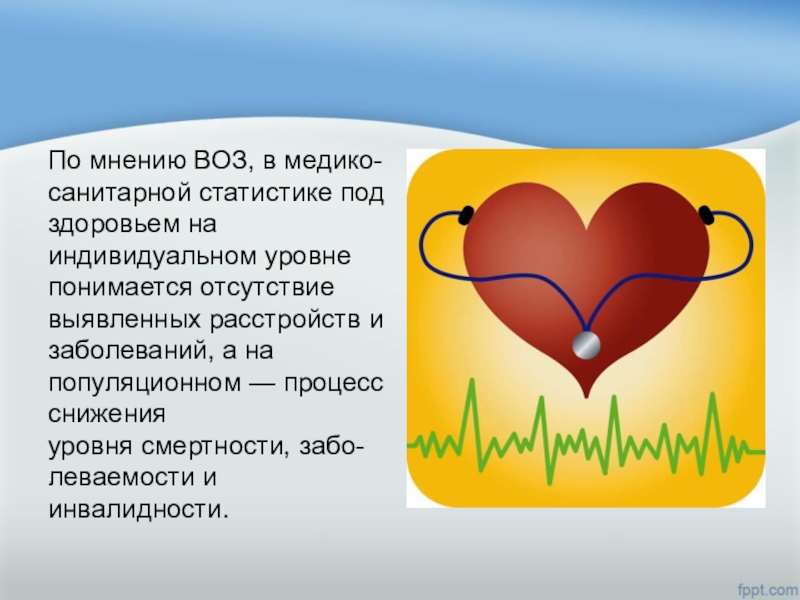 Слайд 8По мнению ВОЗ, в медико-санитарной статистике под здоровьем на индивидуальном уровне
