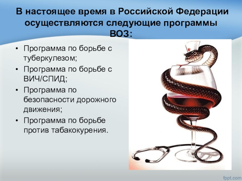 Слайд 6В настоящее время в Российской Федерации осуществляются следующие программы ВОЗ: