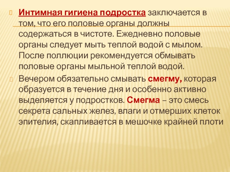Слайд 49Интимная гигиена подростка заключается в том, что его половые органы должны