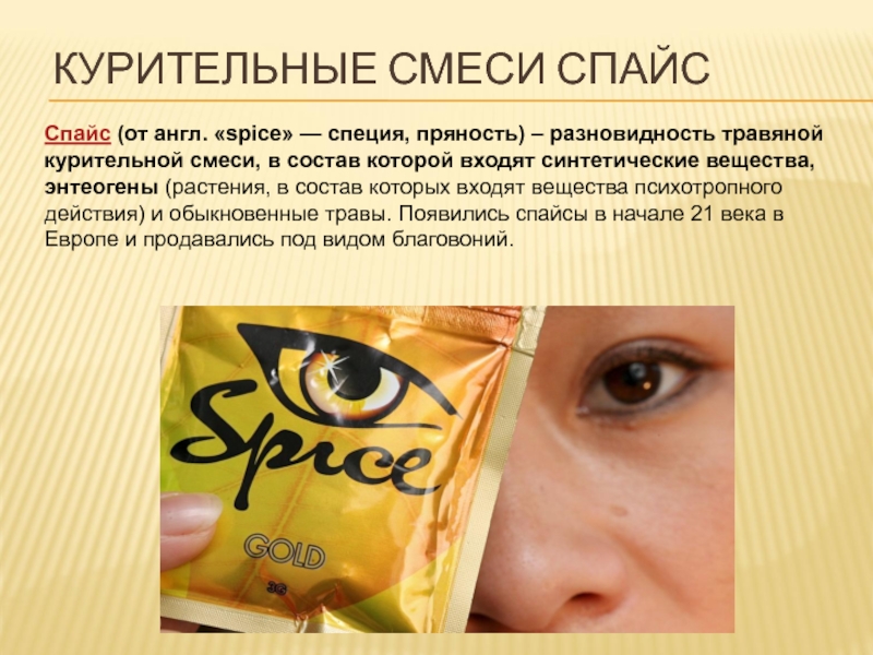курительной смеси, в состав которой входят синтетические вещества, энтеогены (растения, в состав которых входят вещества психотропного действия) и обыкновенные травы. Появились спайсы в начале 21 века в Европе и продавались под видом благовоний.