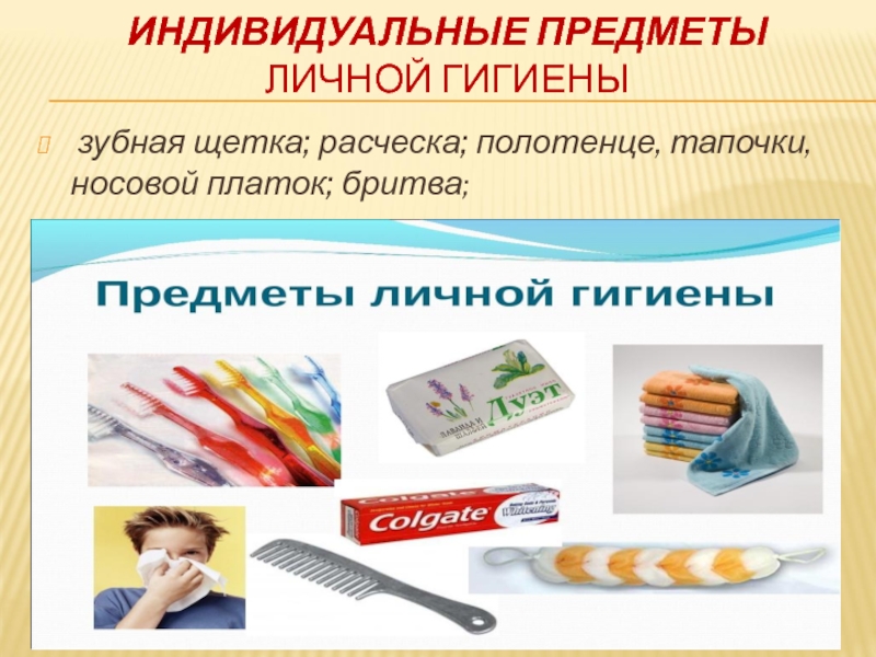 Слайд 40ИНДИВИДУАЛЬНЫЕ ПРЕДМЕТЫ ЛИЧНОЙ ГИГИЕНЫ