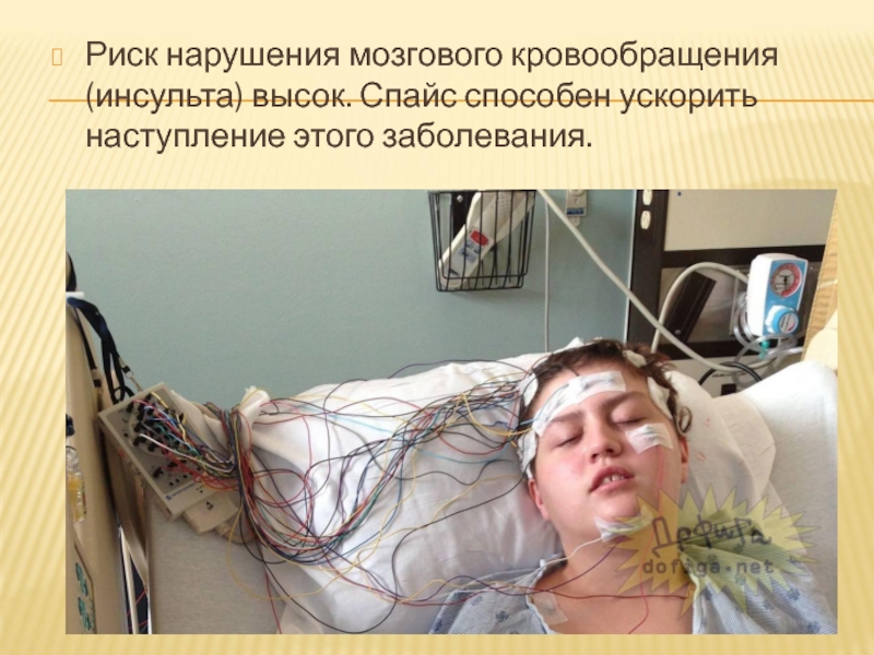 Слайд 14Риск нарушения мозгового кровообращения (инсульта) высок. Спайс способен ускорить наступление этого