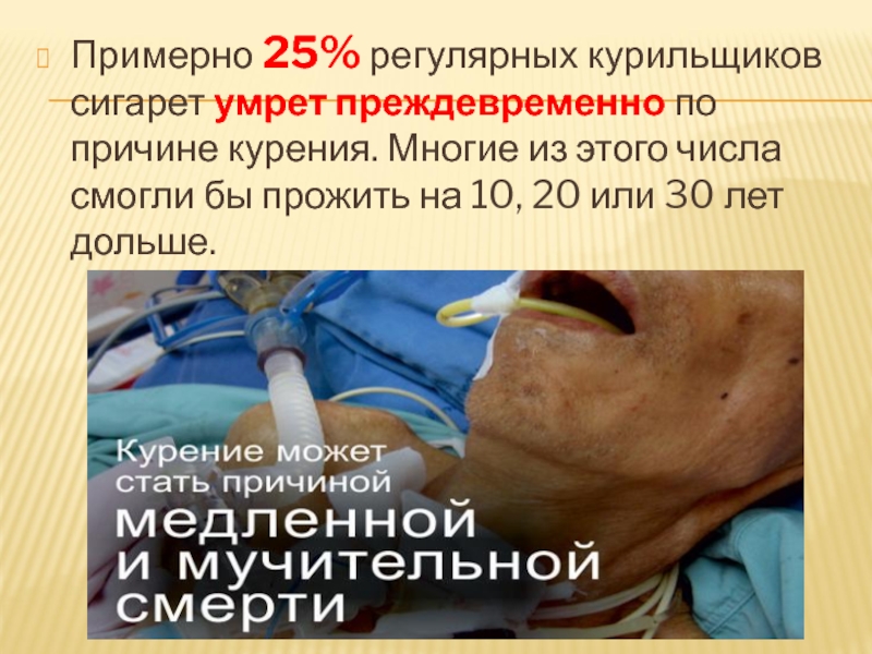 Слайд 7Примерно 25% регулярных курильщиков сигарет умрет преждевременно по причине курения. Многие