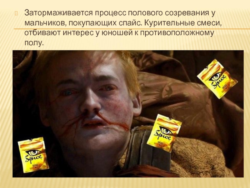 Слайд 12Затормаживается процесс полового созревания у мальчиков, покупающих спайс. Курительные смеси, отбивают