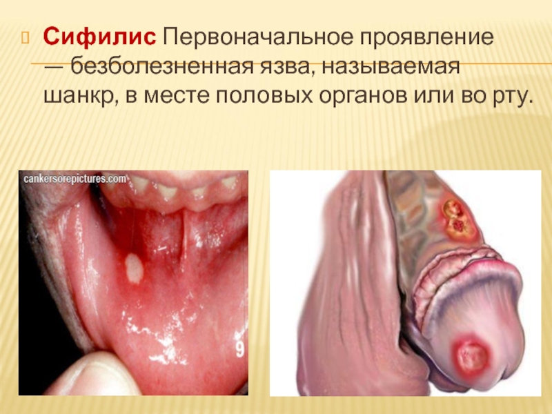 Слайд 54Сифилис Первоначальное проявление — безболезненная язва, называемая шанкр, в месте половых органов
