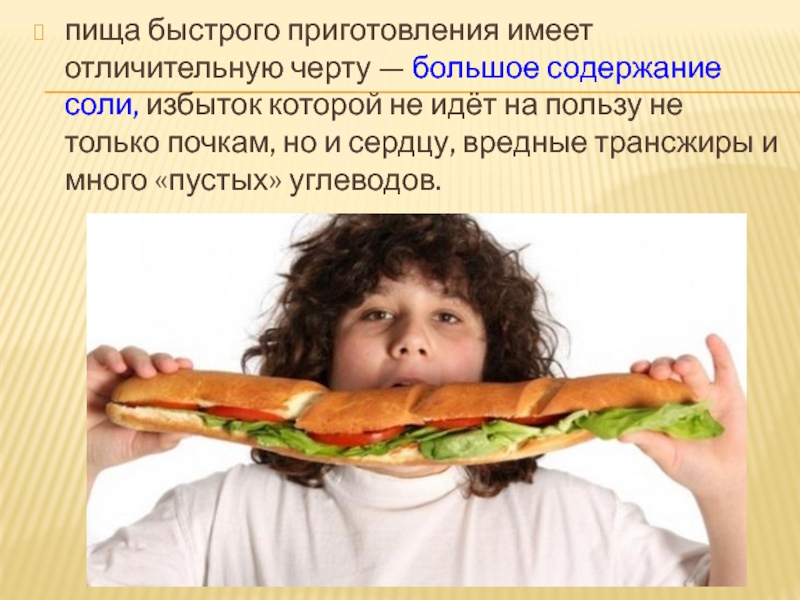 Слайд 26пища быстрого приготовления имеет отличительную черту — большое содержание соли, избыток