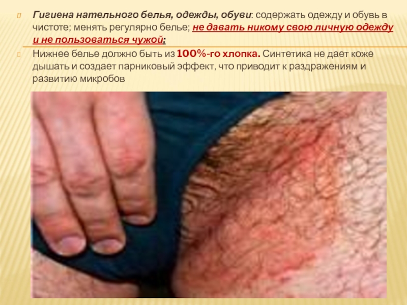 Нижнее белье должно быть из 100%-го хлопка. Синтетика не дает коже дышать и создает парниковый эффект, что приводит к раздражениям и развитию микробов