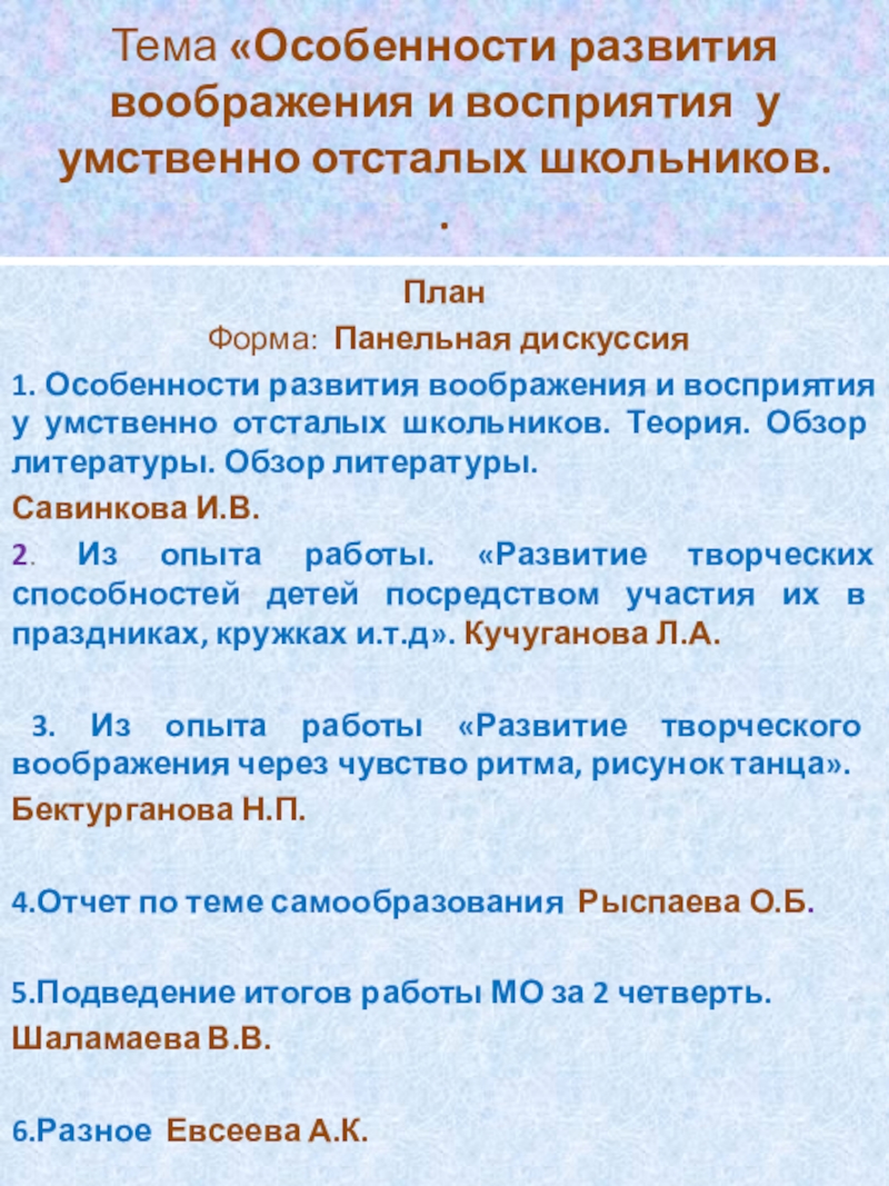 Тема «Особенности развития воображения и восприятия у умственно отсталых школьников.