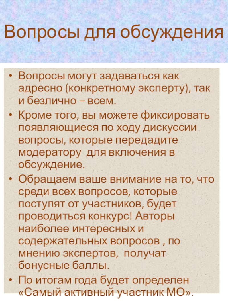 Обращаем ваше внимание на то, что среди всех вопросов, которые поступят от участников, будет проводиться конкурс! Авторы наиболее интересных и содержательных вопросов , по мнению экспертов, получат бонусные баллы.