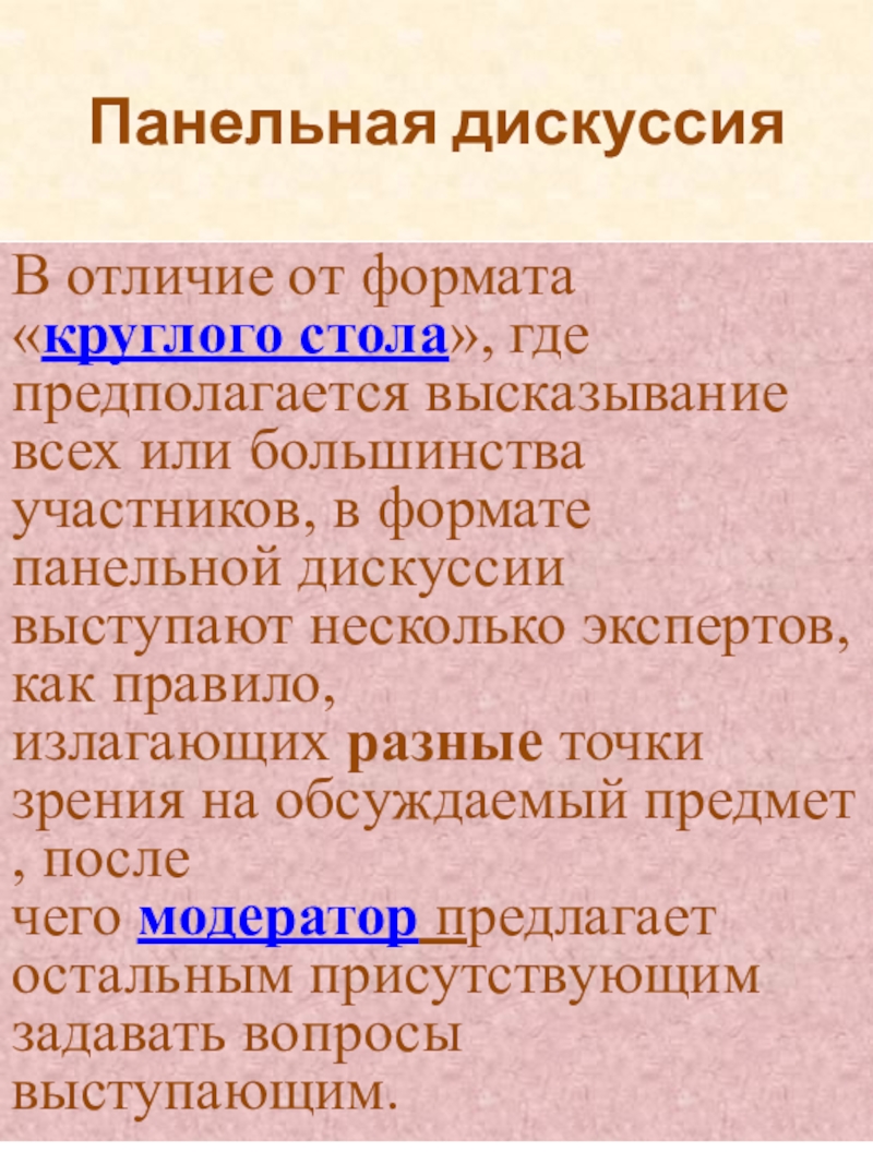 или большинства участников, в формате панельной дискуссии выступают несколько экспертов, как правило, излагающих разные точки зрения на обсуждаемый предмет , после чего модератор предлагает остальным присутствующим задавать вопросы выступающим.