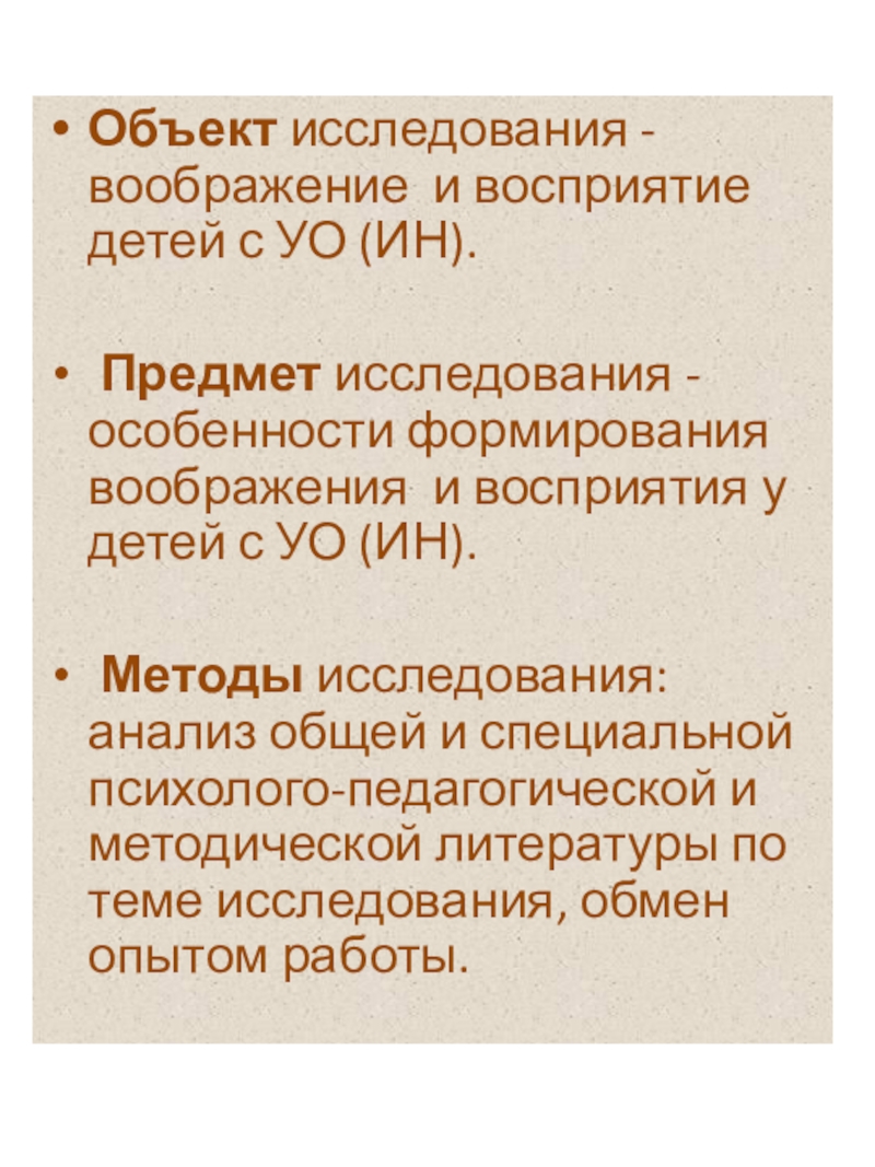 Слайд 4Объект исследования - воображение и восприятие детей с УО (ИН).