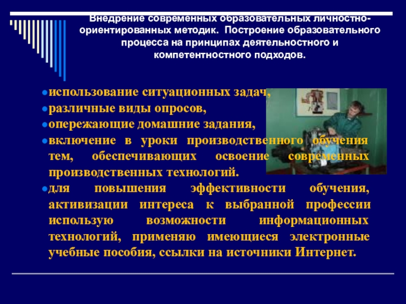 для повышения эффективности обучения, активизации интереса к выбранной профессии использую возможности информационных технологий, применяю имеющиеся электронные учебные пособия, ссылки на источники Интернет.