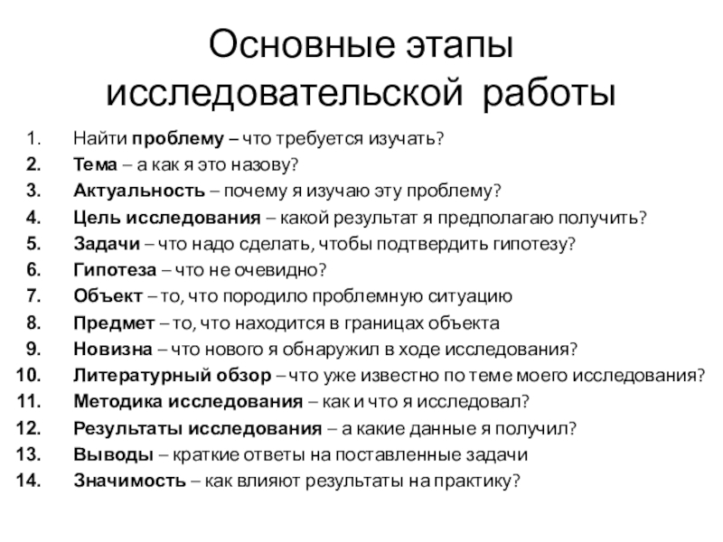 Основные этапы исследовательской работыНайти проблему – что требуется изучать?Тема – а как я это назову?Актуальность – почему