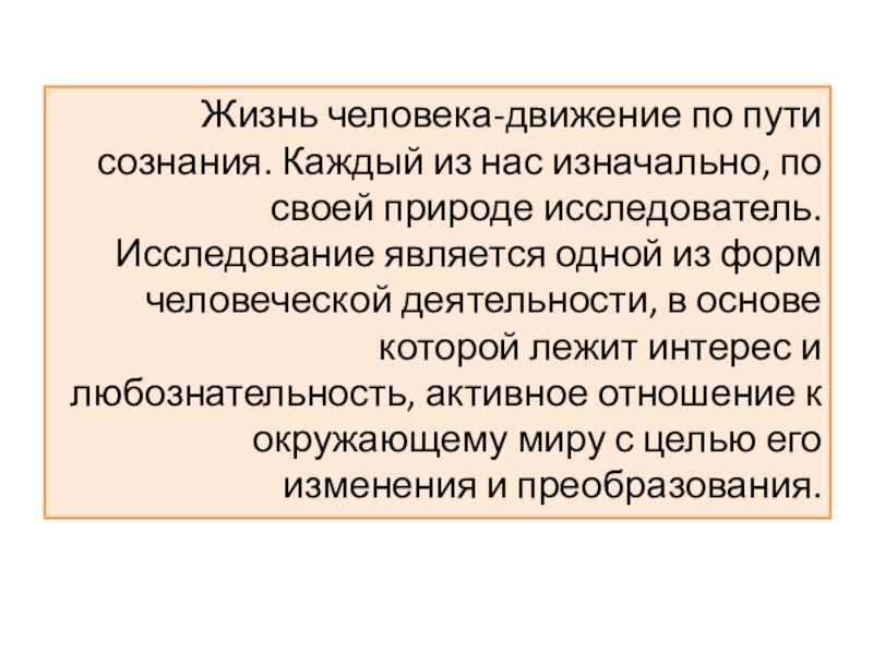 Жизнь человека-движение по пути сознания. Каждый из нас изначально, по своей природе исследователь. Исследование является одной из форм человеческой деятельности, в основе которой лежит интерес и любознательность, активное отношение к окружающему миру с целью его изменения