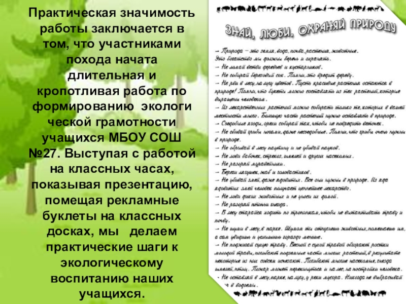 и кропотливая работа по формированию экологической грамотности учащихся МБОУ СОШ №27. Выступая с работой на классных часах, показывая презентацию, помещая рекламные буклеты на классных досках, мы делаем практические шаги к экологическому воспитанию наших учащихся.