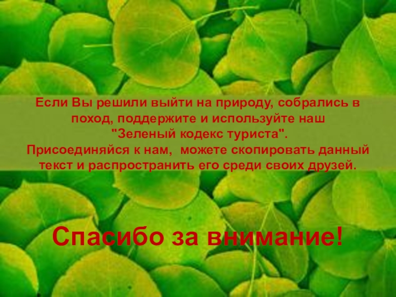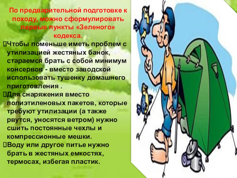 Слайд 10По предварительной подготовке к походу, можно сформулировать первые пункты «Зеленого» кодекса.