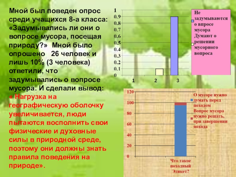 о вопросе мусора, посещая природу?» Мной было опрошено 26 человек и лишь 10% (3 человека) ответили, что задумывались о вопросе мусора. И сделали вывод: « Нагрузка на географическую оболочку увеличивается, люди пытаются восполнить свои физические и духовные силы в природной среде, поэтому они должны знать правила поведения на природе».