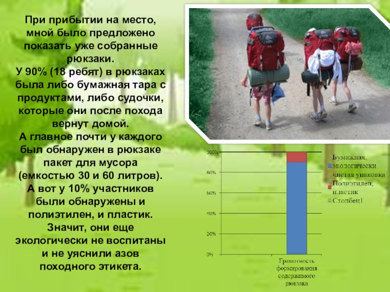 Слайд 9При прибытии на место, мной было предложено показать уже собранные рюкзаки.