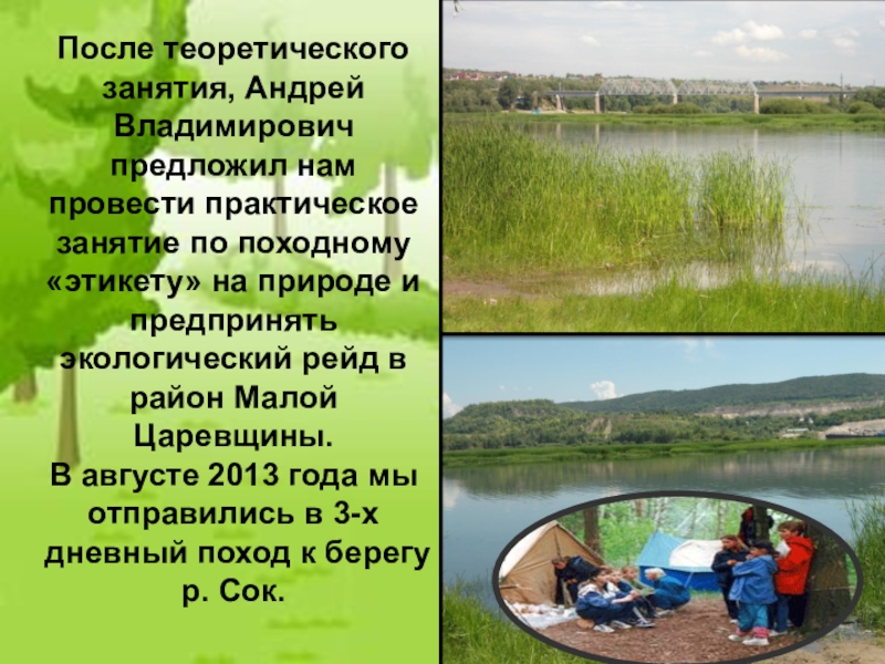 5.Оценить экологическую ситуацию в районе отдыха на берегу р. Сок (Малая Царевщина). Оповестить отдыхающих о результатах исследования.