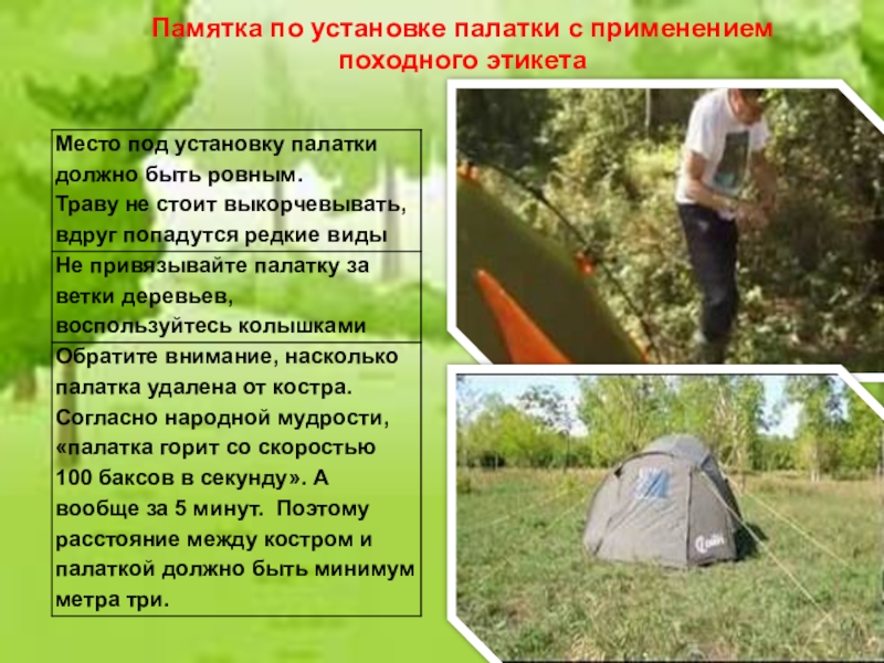 Слайд 14Памятка по установке палатки с применением походного этикета