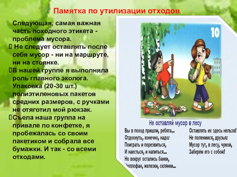 Не следует оставлять после себя мусор - ни на маршруте, ни на стоянке.
