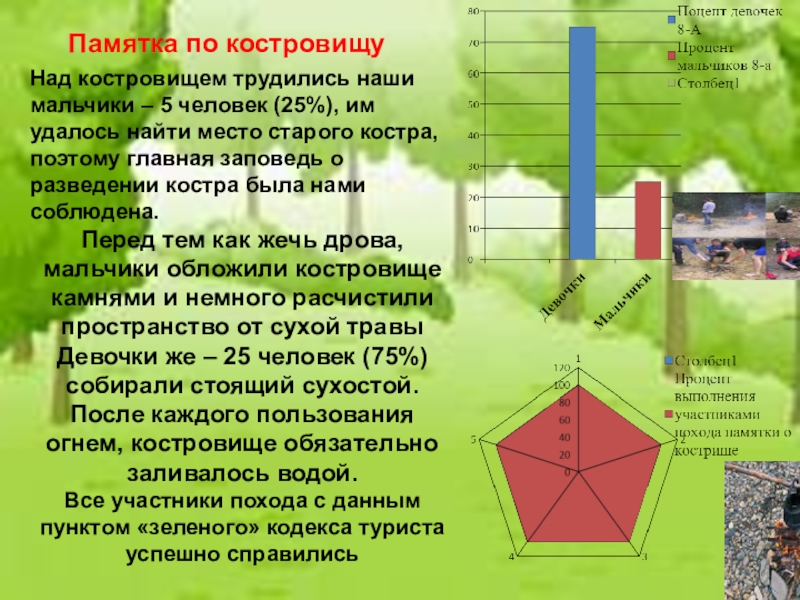 Девочки же – 25 человек (75%) собирали стоящий сухостой. После каждого пользования огнем, костровище обязательно заливалось водой.