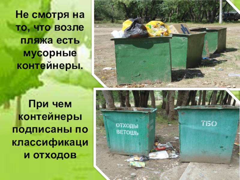 Слайд 12Не смотря на то, что возле пляжа есть мусорные контейнеры.