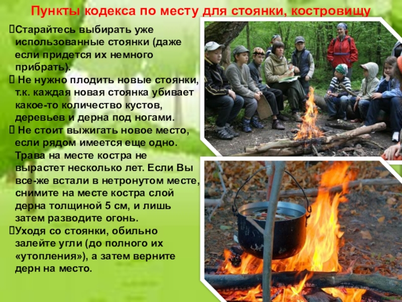 Слайд 15Пункты кодекса по месту для стоянки, костровищу