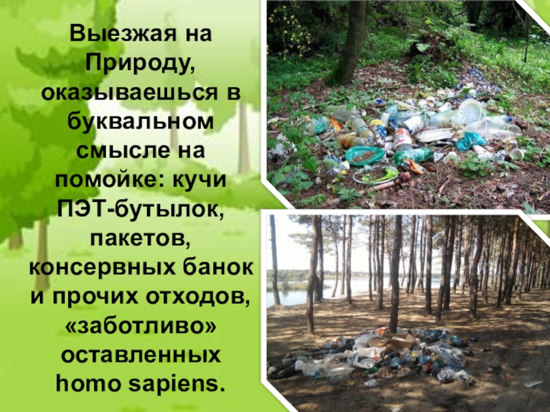 Слайд 4Выезжая на Природу, оказываешься в буквальном смысле на помойке: кучи ПЭТ-бутылок,