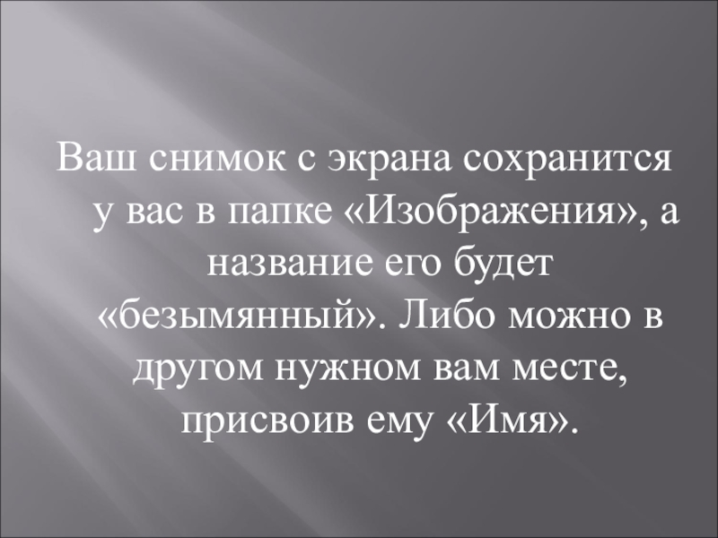 Ваш снимок с экрана сохранится у вас в папке «Изображения», а название его будет «безымянный». Либо можно