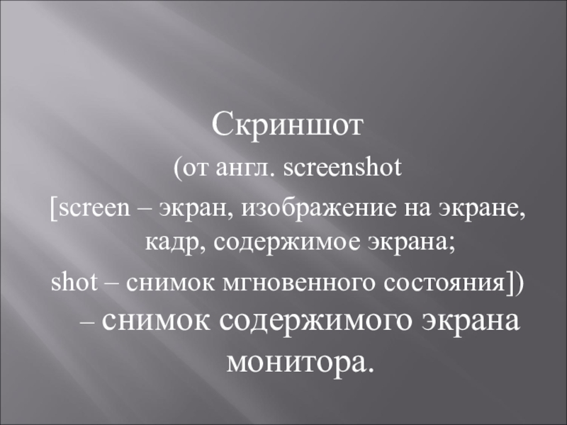 Скриншот(от англ. screenshot [screen – экран, изображение на экране, кадр, содержимое экрана; shot – снимок мгновенного состояния]) – снимок содержимого экрана монитора.