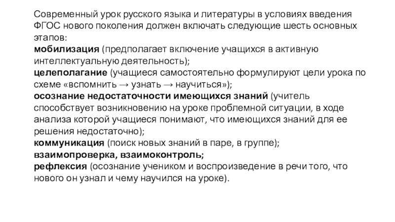 Современный урок русского языка и литературы в условиях введения ФГОС нового поколения должен включать следующие шесть основных этапов:мобилизация (предполагает включение учащихся в активную интеллектуальную деятельность);целеполагание (учащиеся самостоятельно формулируют цели урока по схеме «вспомнить → узнать → научиться»);осознание недостаточности