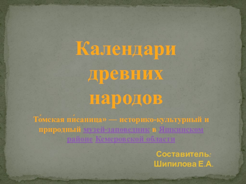 Календари древних народовТо́мская пи́саница» — историко-культурный и природный музей-заповедник в Яшкинском районе Кемеровской области Составитель: Шипилова Е.А.