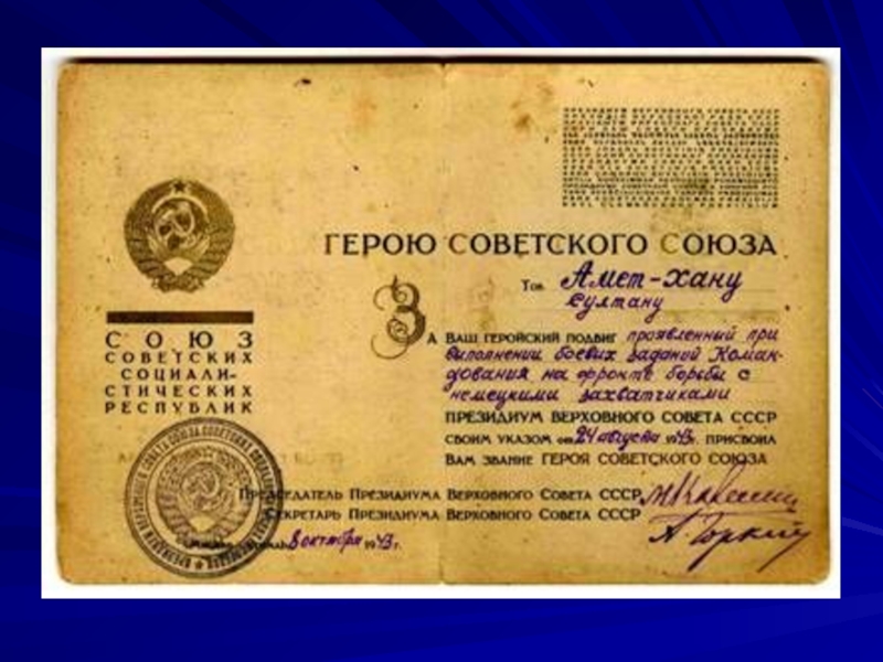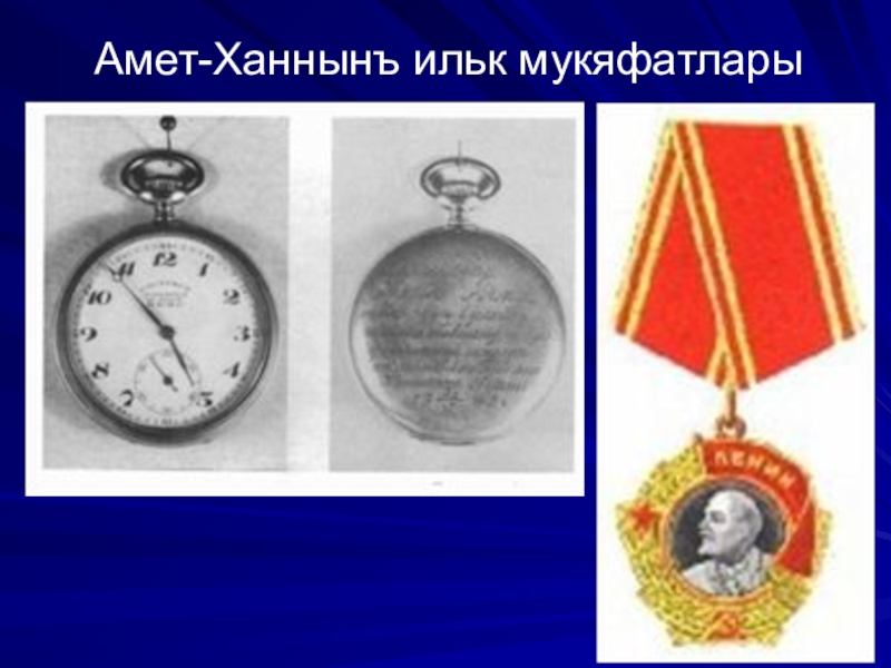 Слайд 9Амет-Ханнынъ ильк мукяфатлары
