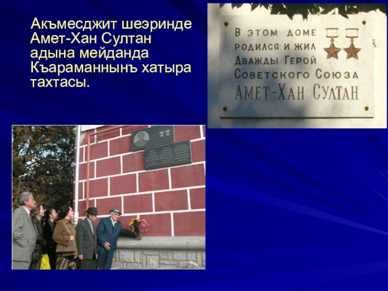 Слайд 21 Акъмесджит шеэринде Амет-Хан Султан адына мейданда Къараманнынъ хатыра