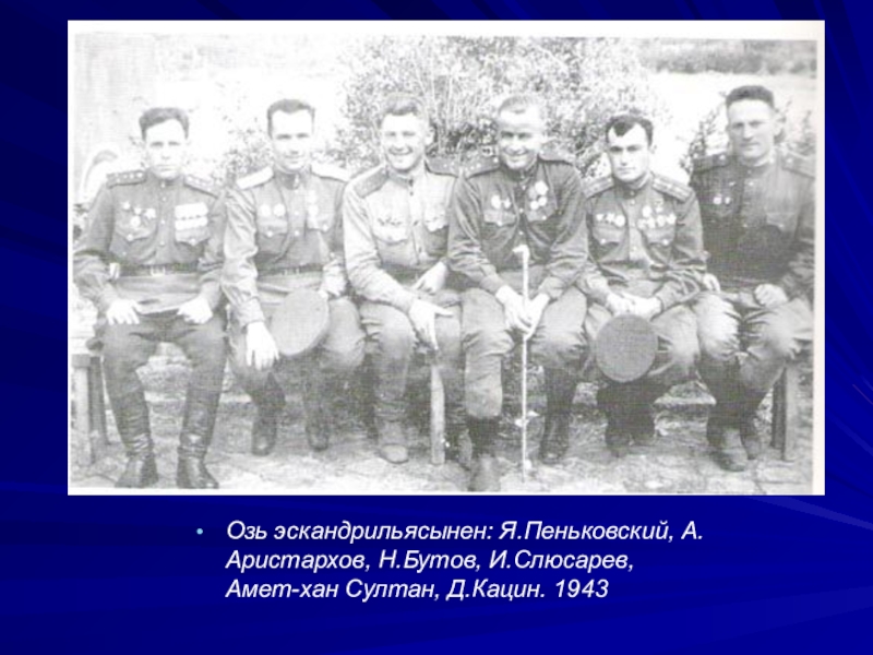 Слайд 11Озь эскандрильясынен: Я.Пеньковский, А.Аристархов, Н.Бутов, И.Слюсарев, Амет-хан Султан, Д.Кацин. 1943
