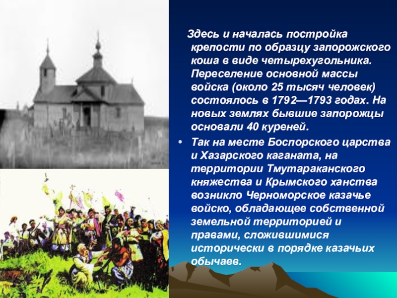 Так на месте Боспорского царства и Хазарского каганата, на территории Тмутараканского княжества и Крымского ханства возникло Черноморское казачье войско, обладающее собственной земельной территорией и правами, сложившимися исторически в порядке казачьих обычаев.