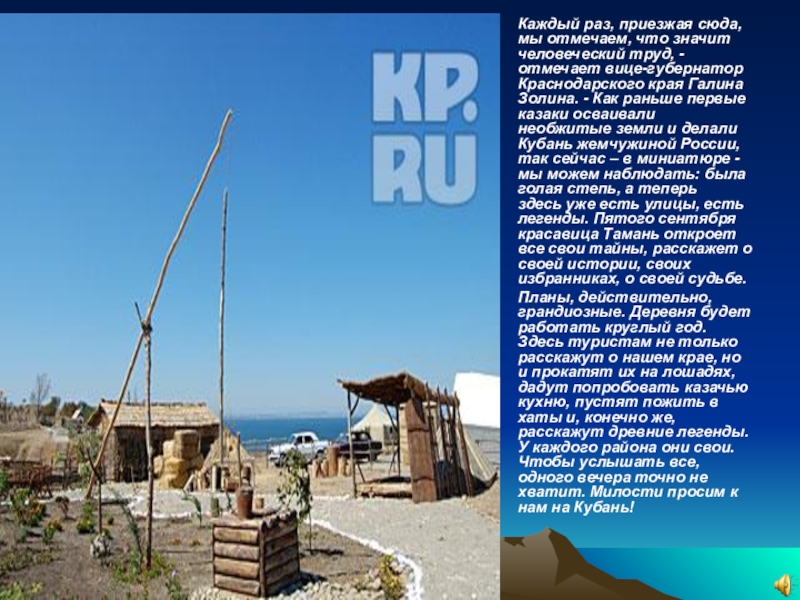 Планы, действительно, грандиозные. Деревня будет работать круглый год. Здесь туристам не только расскажут о нашем крае, но и прокатят их на лошадях, дадут попробовать казачью кухню, пустят пожить в хаты и, конечно же, расскажут древние легенды. У каждого района они свои. Чтобы услышать все, одного вечера точно не хватит. Милости просим к нам на Кубань!