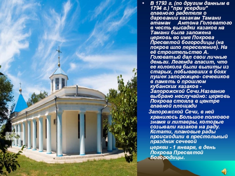 главного радетеля о даровании казакам Тамани атаман Антона Головатого в честь высадки казаков на Тамани была заложена церковь во имя Покрова Пресвятой богородицы (на покров шло переселение). На её строительство А. Головатый дал свои личные деньги. Легенда гласит, что ее колокола были вылиты из старых, побывавших в боях пушек запорожцев- сечевиков в память о прошлом кубанских казаков - Запорожской Сечи.Название выбрано неслучайно: церковь Покрова стояла в центре главной площади