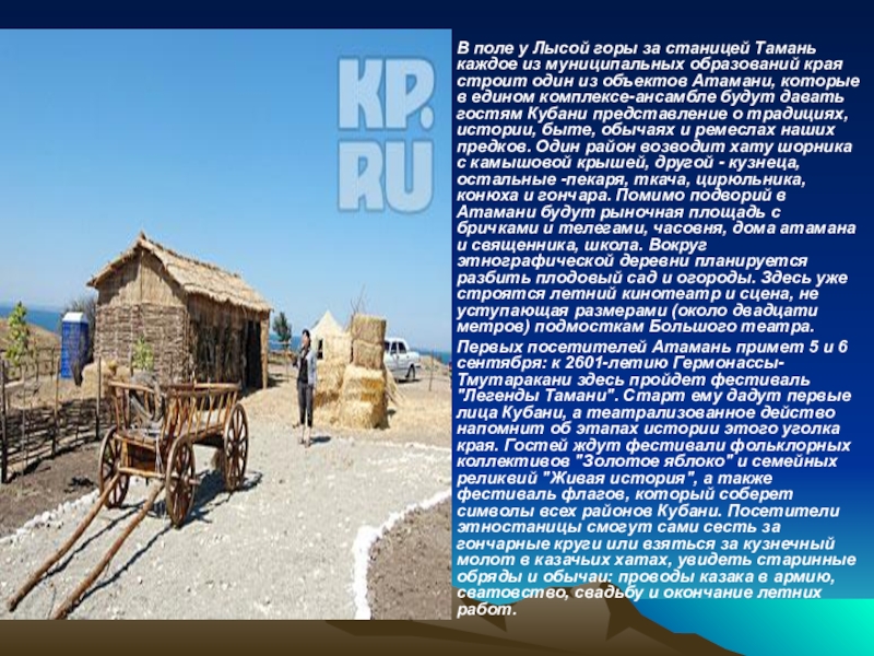 образований края строит один из объектов Атамани, которые в едином комплексе-ансамбле будут давать гостям Кубани представление о традициях, истории, быте, обычаях и ремеслах наших предков. Один район возводит хату шорника с камышовой крышей, другой - кузнеца, остальные -пекаря, ткача, цирюльника, конюха и гончара. Помимо подворий в Атамани будут рыночная площадь с бричками и телегами, часовня, дома атамана и священника, школа. Вокруг этнографической деревни планируется разбить плодовый сад и огороды. Здесь уже строятся летний кинотеатр и сцена, не уступающая размерами (около двадцати метров) подмосткам Большого театра.