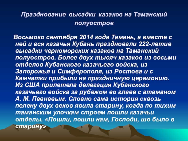 Тамань, а вместе с ней и вся казачья Кубань праздновали 222-летие высадки черноморских казаков на Таманский полуостров. Более двух тысяч казаков из восьми отделов Кубанского казачьего войска, из Запорожья и Симферополя, из Ростова и с Камчатки прибыли на праздничную церемонию. Из США прилетела делегация Кубанского казачьего войска за рубежом во главе с атаманом А. М. Певневым. Словно сама история сквозь пелену двух веков явила старину, когда по тихим таманским улочкам строем пошли казачьи отделы. «Пошли, пошли нам, Господи, шо было в старину»