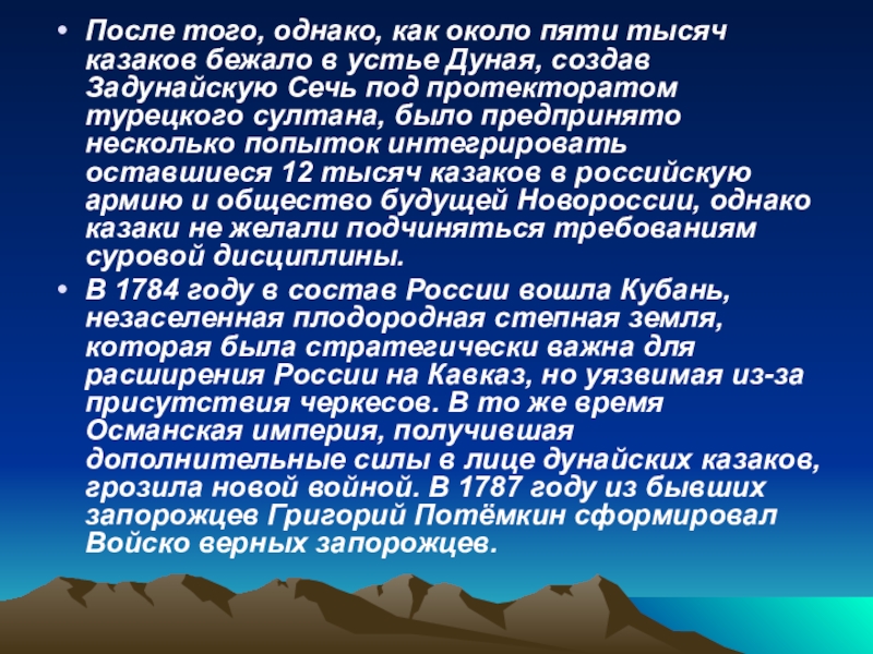 Дуная, создав Задунайскую Сечь под протекторатом турецкого султана, было предпринято несколько попыток интегрировать оставшиеся 12 тысяч казаков в российскую армию и общество будущей Новороссии, однако казаки не желали подчиняться требованиям суровой дисциплины.