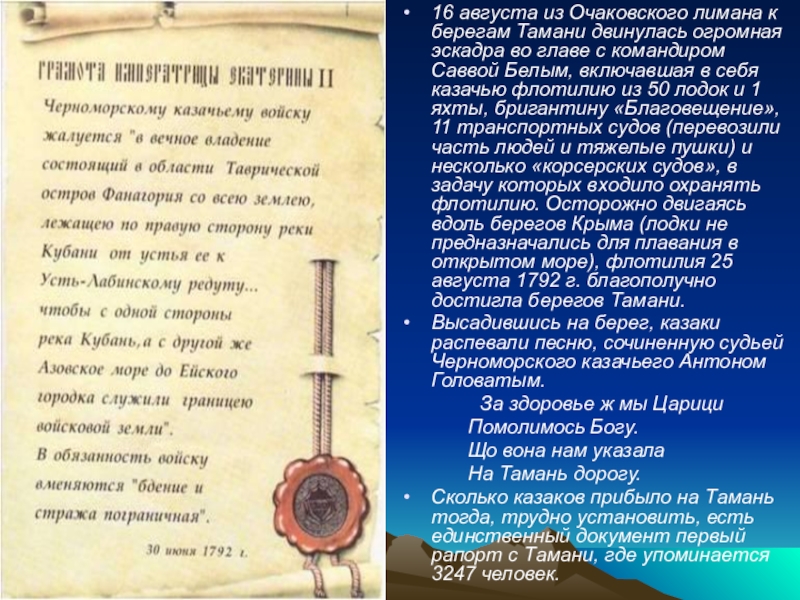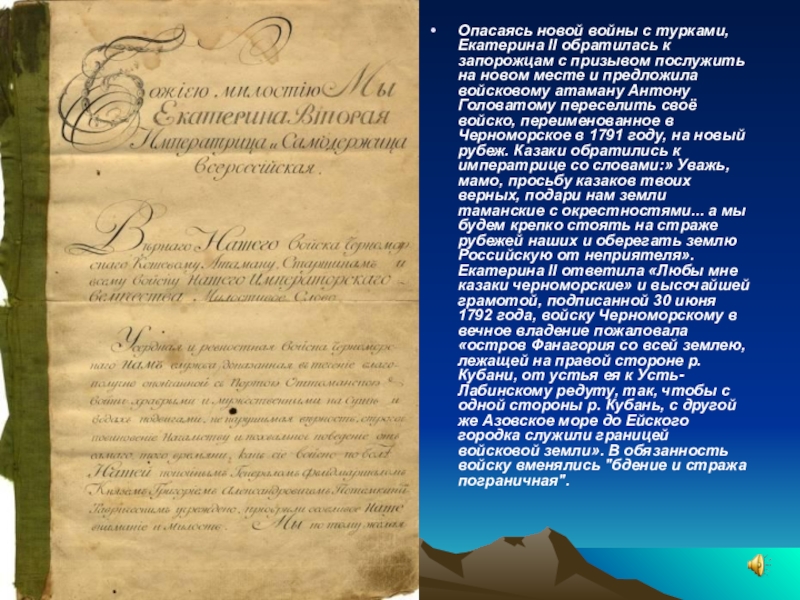призывом послужить на новом месте и предложила войсковому атаману Антону Головатому переселить своё войско, переименованное в Черноморское в 1791 году, на новый рубеж. Казаки обратились к императрице со словами:» Уважь, мамо, просьбу казаков твоих верных, подари нам земли таманские с окрестностями... а мы будем крепко стоять на страже рубежей наших и оберегать землю Российскую от неприятеля». Екатерина II ответила «Любы мне казаки черноморские» и высочайшей грамотой, подписанной 30 июня 1792 года, войску Черноморскому в вечное владение пожаловала «остров Фанагория со всей землею, лежащей на правой стороне р. Кубани, от устья ея к Усть-Лабинскому редуту, так, чтобы с одной стороны р. Кубань, с другой же Азовское море до Ейского городка служили границей войсковой земли». В обязанность войску вменялись "бдение и стража пограничная".